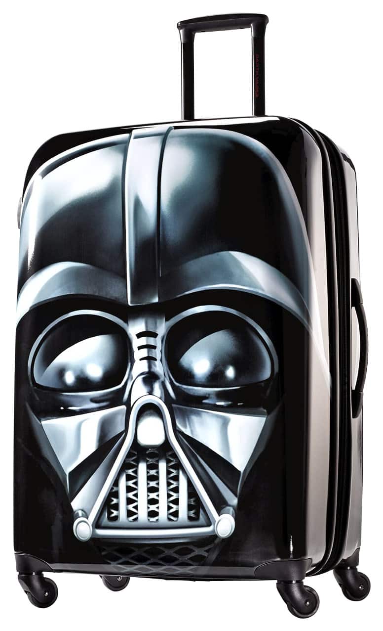 This fun suitcase has two interior compartments with mesh interior pockets. Its large size has ample room for clothes and travel gear. Its polycarbonate construction provides extra strength against travel damage. Its push button handle extends with one touch for easy operation. Spinner wheels offer smooth and simple movement. Its fun Darth Vader theme allows children (and adults) to show off their quirky style. The American Tourister Star Wars range also features a C3PO, general Star Wars, and R2D2 designs. These themed suitcases are also available in cabin size.